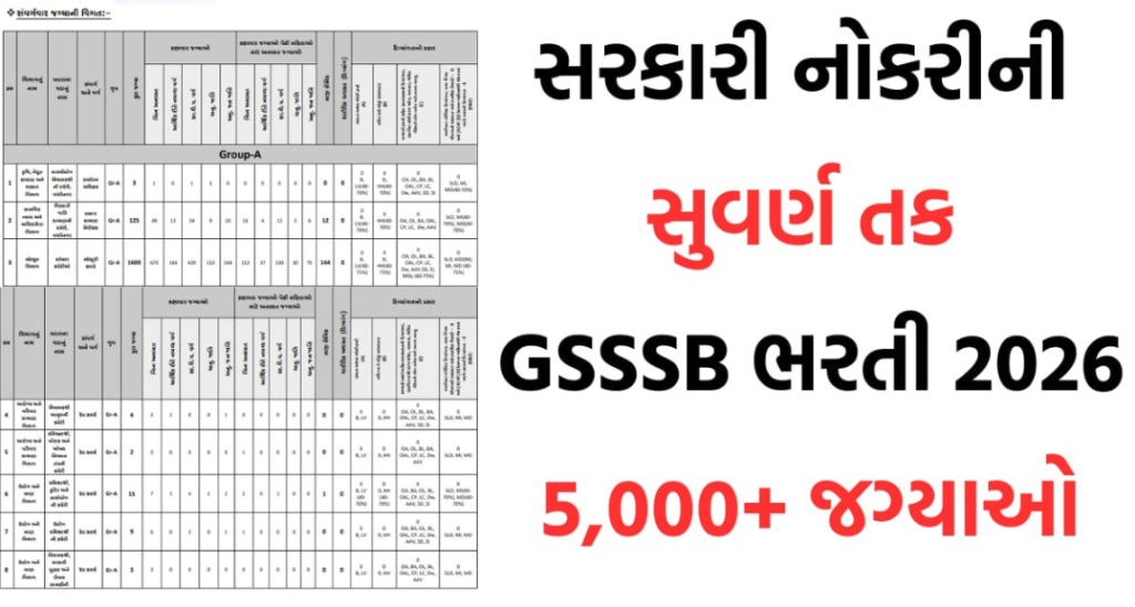 ગુજરાત સરકારમાં નોકરી મેળવવાનું સપનું જોતા લાખો યુવાનો માટે વર્ષ 2026 એક સુવર્ણ તક લઈને આવ્યું છે. ગુજરાત ગૌણ સેવા પસંદગી મંડળ (GSSSB – Gujarat Subordinate Service Selection Board) દ્વારા રાજ્યના વહીવટી માળખાને વધુ મજબૂત કરવા માટે અનેક વિભાગોમાં હજારો જગ્યાઓ પર ઐતિહાસિક ભરતીની જાહેરાતો કરવામાં આવી છે. આ વર્ષે માત્ર ક્લાર્ક જ નહીં, પરંતુ એન્જિનિયરિંગ, મેડિકલ અને આરોગ્ય વિભાગમાં પણ મોટા પાયે ભરતી પ્રક્રિયા હાથ ધરવામાં આવી રહી છે.
